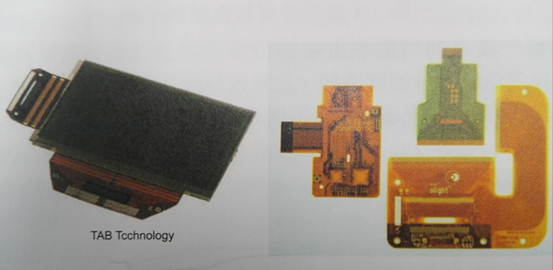 為了能進(jìn)行組裝并搭配顯示器、特殊裝置連接,業(yè)者發(fā)展出特殊組裝結(jié)構(gòu)。比較早的結(jié)構(gòu)采用卷帶自動結(jié)合技術(shù)(TAB-Tape Automation Bonding)進(jìn)行晶片組裝,之后為了能提升結(jié)合密度而改用FPC覆晶組裝(COF-Chip on Fiex)做晶片結(jié)合。這兩類典型FPC產(chǎn)品,如圖所示: