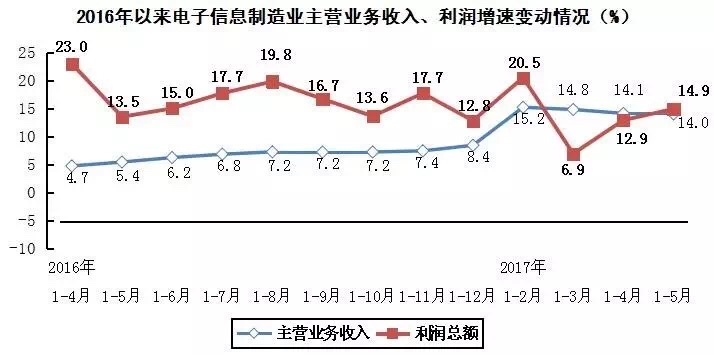 手機FPC速遞一份1-5月我國電子信息制造業(yè)運行情況:2017年1-5月份,我國電子信息制造業(yè)總體呈現(xiàn)穩(wěn)中向好的發(fā)展態(tài)勢。行業(yè)生產(chǎn)增速持續(xù)加快,出口形勢明顯好轉(zhuǎn),效益狀況總體良好,固定資產(chǎn)投資加快增長,企業(yè)虧損面繼續(xù)收窄。