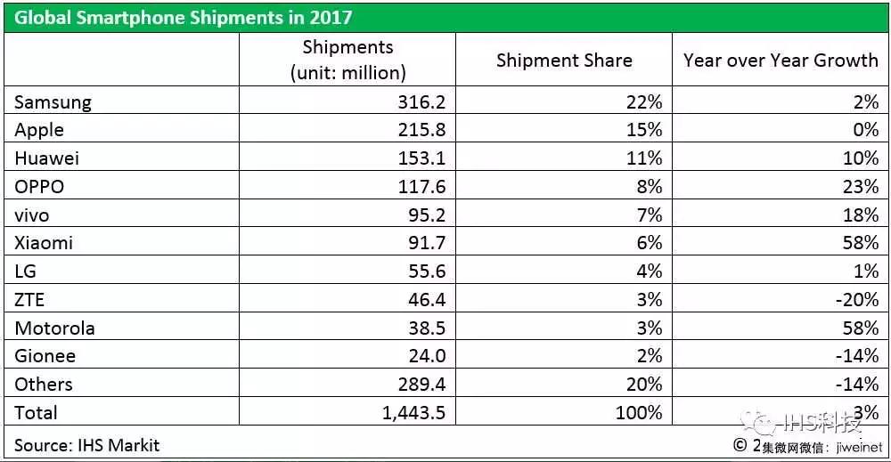 2017年全球智能手機(jī)份額Top10