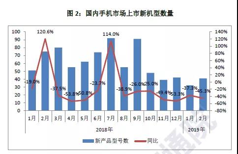 2019年2月,智能手機(jī)上市新機(jī)型36款,同比下降36.8%,占同期手機(jī)上市新機(jī)型數(shù)量的87.8%,其中支持Android操作系統(tǒng)的手機(jī)36款。