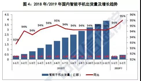 2019年1~2月,智能手機(jī)出貨量4613.5萬部,同比下降14.2%,占同期手機(jī)出貨量的95.0%,其中Android手機(jī)在智能手機(jī)中占比92.5%。