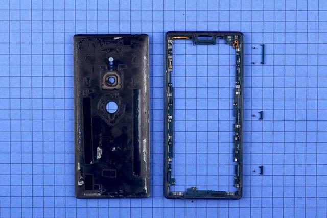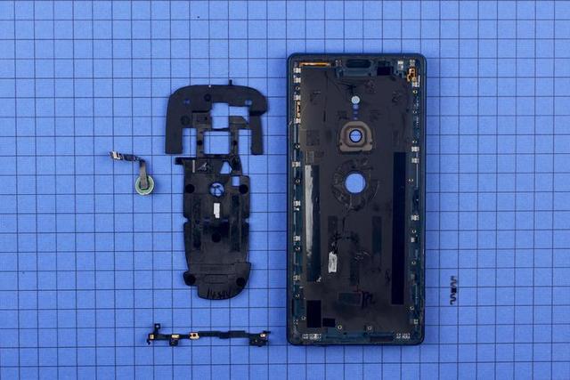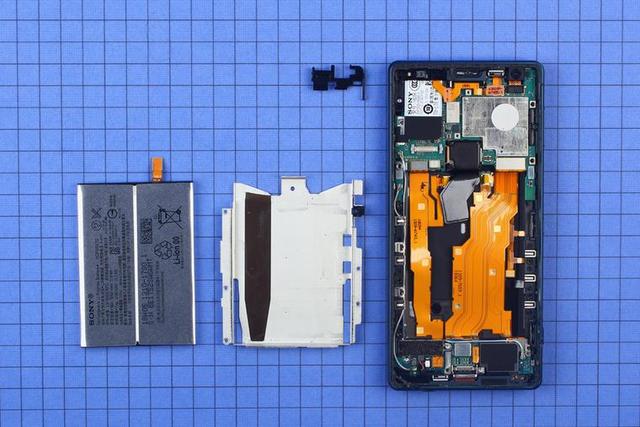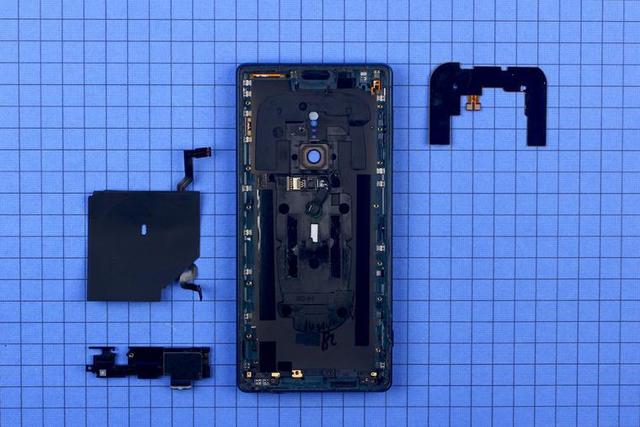 擰下螺絲將蓋板取下,內(nèi)部結(jié)構(gòu)盡在眼前。盡管要從屏幕開(kāi)始拆起,但 Xperia XZ2 采用的依然是安卓手機(jī)非常常見(jiàn)的三段式結(jié)構(gòu), BTB 連接板被設(shè)計(jì)到電池下方,使得整體觀感變得整齊劃一。