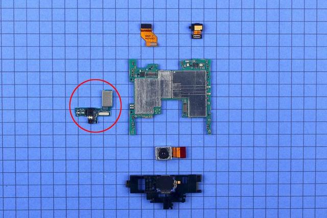 除了常見(jiàn)手機(jī)底部的副板外, Xperia XZ2 還有一塊小副板在主板附近。這塊小副板上集成了 IR 、激光感應(yīng)器和閃光燈,通過(guò)一塊小小的連接軟板與主板相連。