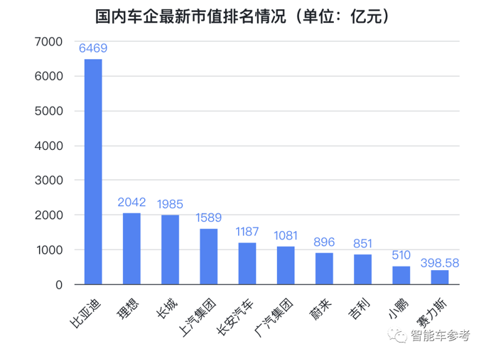 從國(guó)內(nèi)車企市值最新排名情況來(lái)看,目前表現(xiàn)為:比亞迪第一、理想第二、長(zhǎng)城第三。