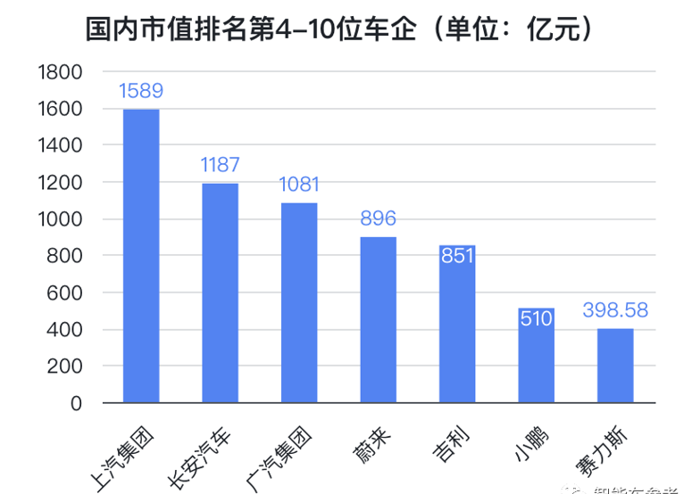除了前三名以外,最新數(shù)據(jù)顯示,市值排在全國(guó)第4-10的依次是:上汽集團(tuán)、長(zhǎng)安、廣汽集團(tuán)、蔚來(lái)、吉利、小鵬、賽力斯。